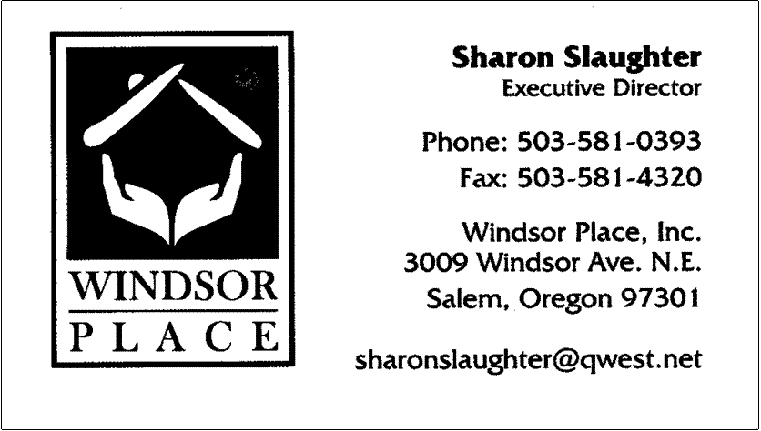 WWindsor Place: a 15 bed facility specializing in the care fo traumatically brain injured adults.  Our residents participate in a program that will encourage them to maximize their independence of which they are capable while rehabilitanting them.  With an interdisciplinary team consisting of staff, Occupational, Physical, Speech and Behavioral therapists, the residents are encouraged to reach their potential with the hope that they will be able to transition to a more independent lifestyle in the community. Residential housing for people with TBI in Salem. Sharon Slaughter,
